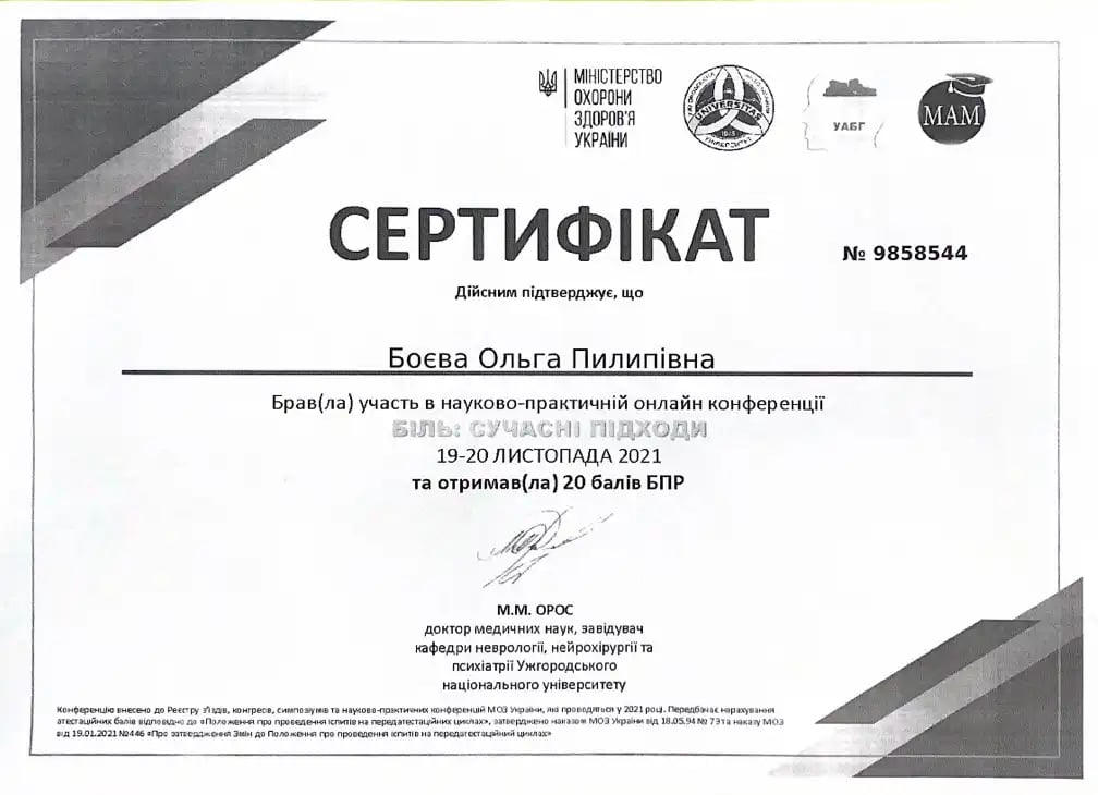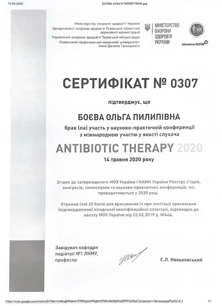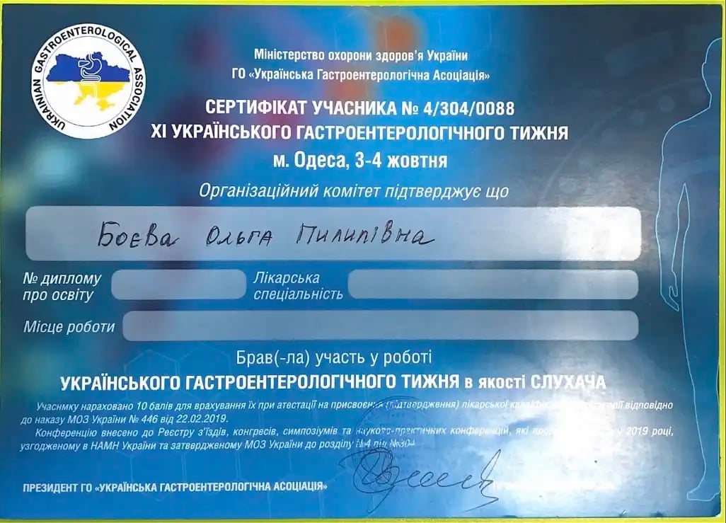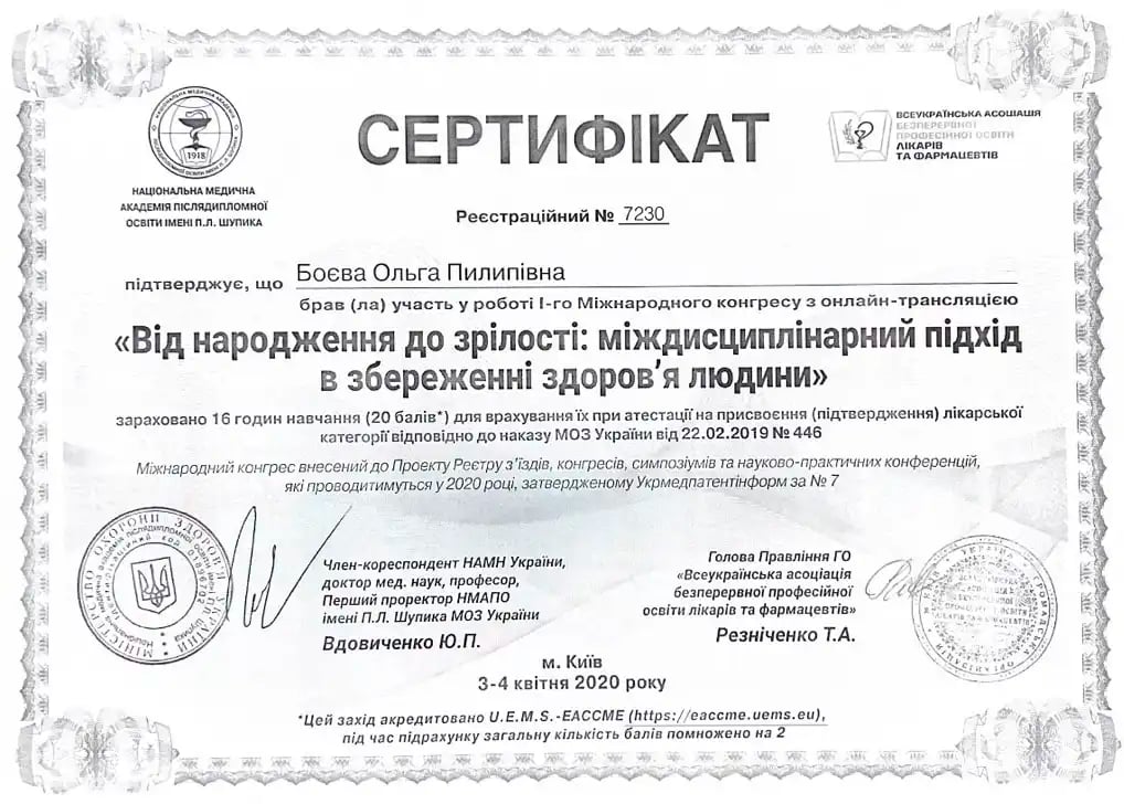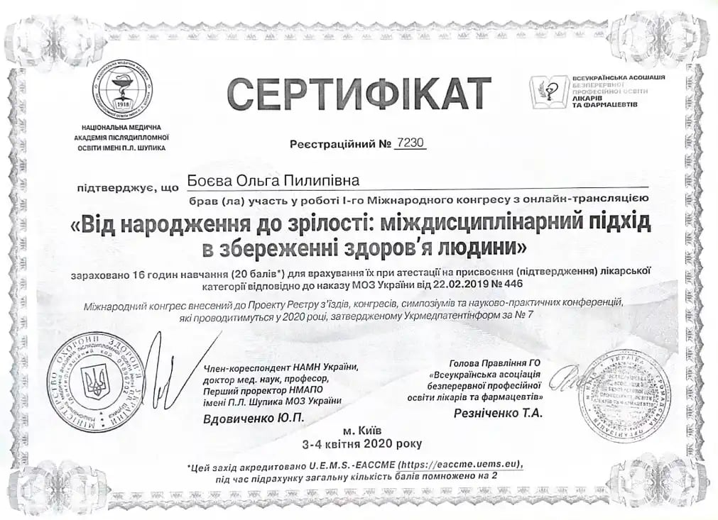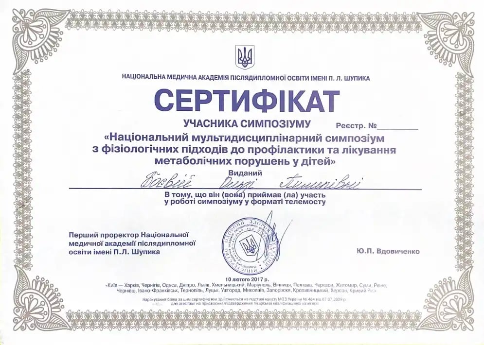 Закончила интернатуру на базе Черкасской городской детской больницы по специальности «Педиатрия»