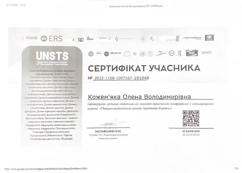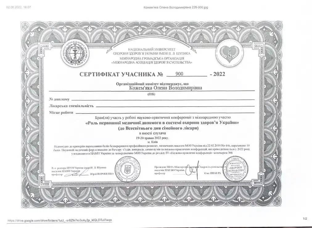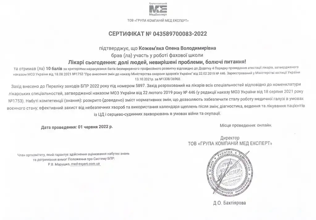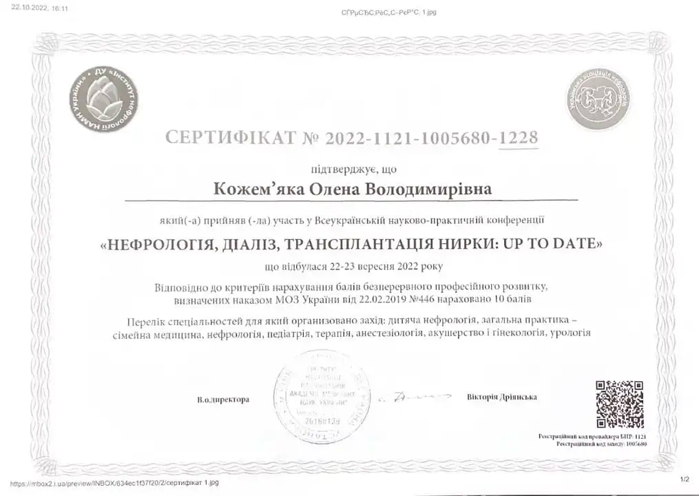 Подтверждено звание специалиста по специальности «нефрология» Национальной медицинской академии последипломного образования имени П.Л. Шупика