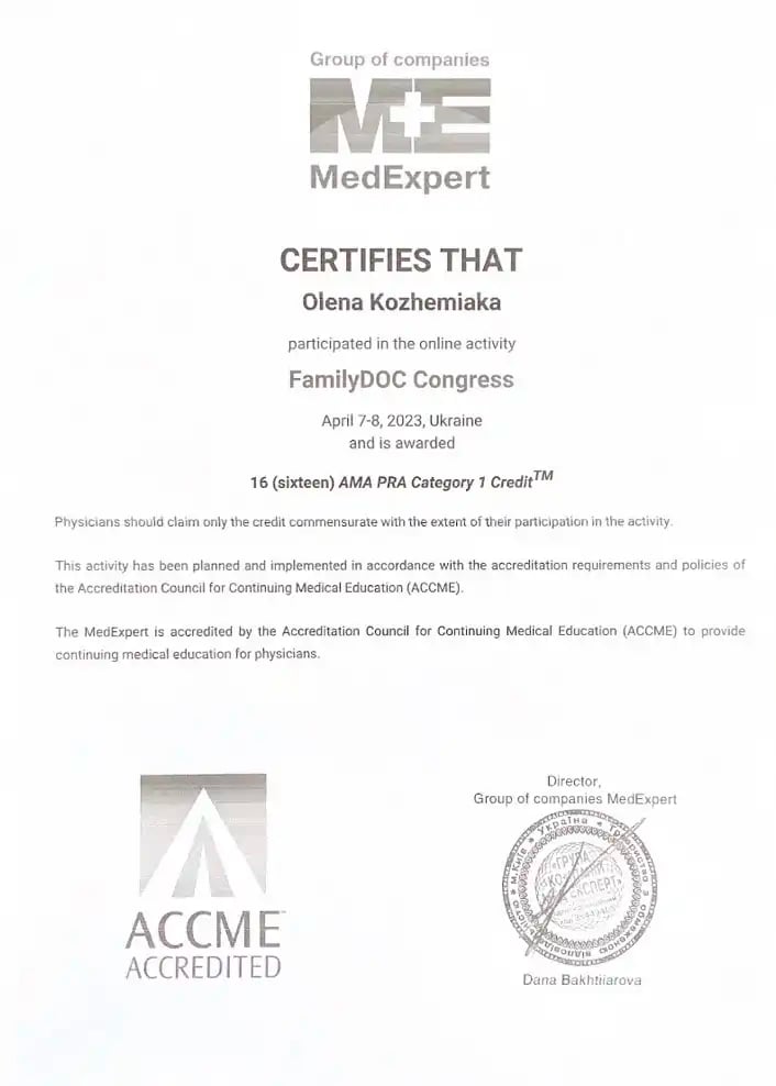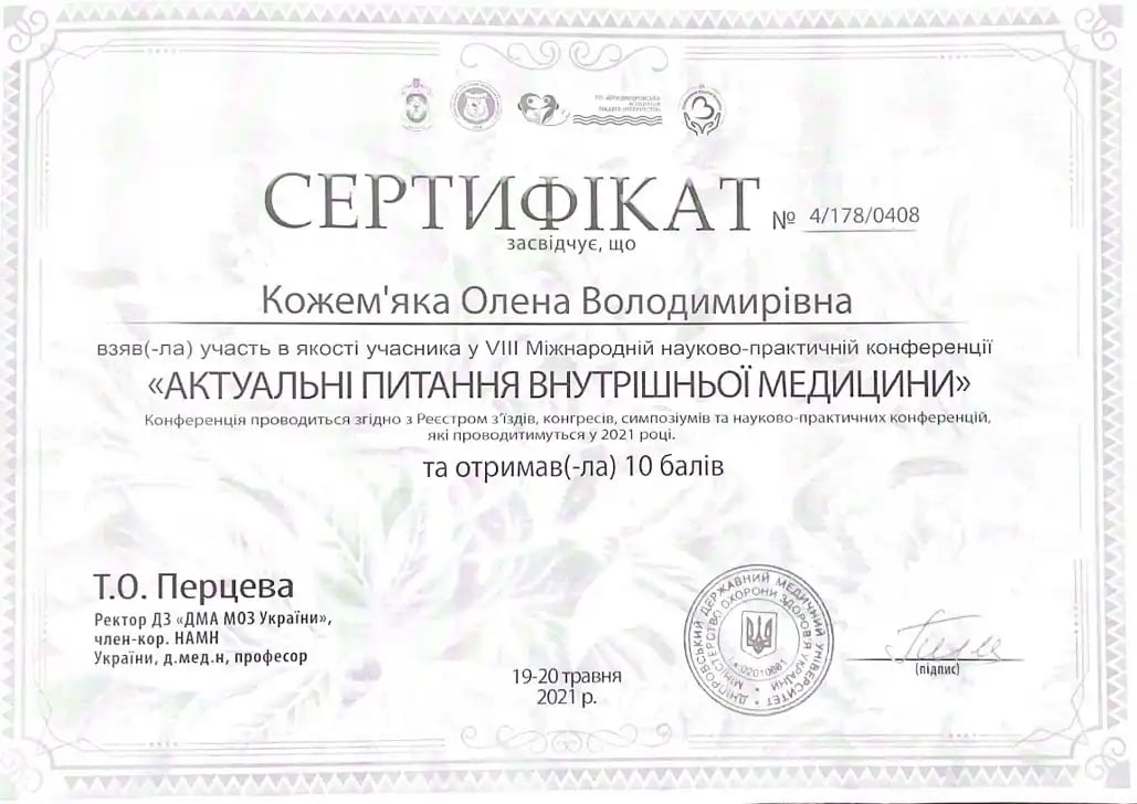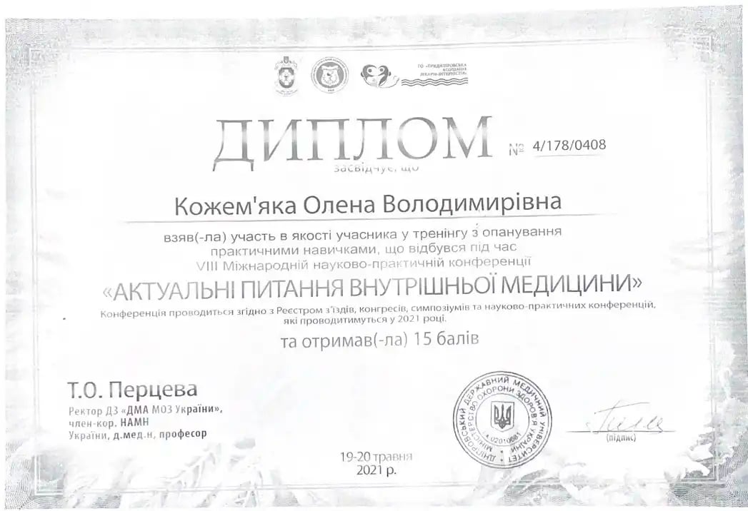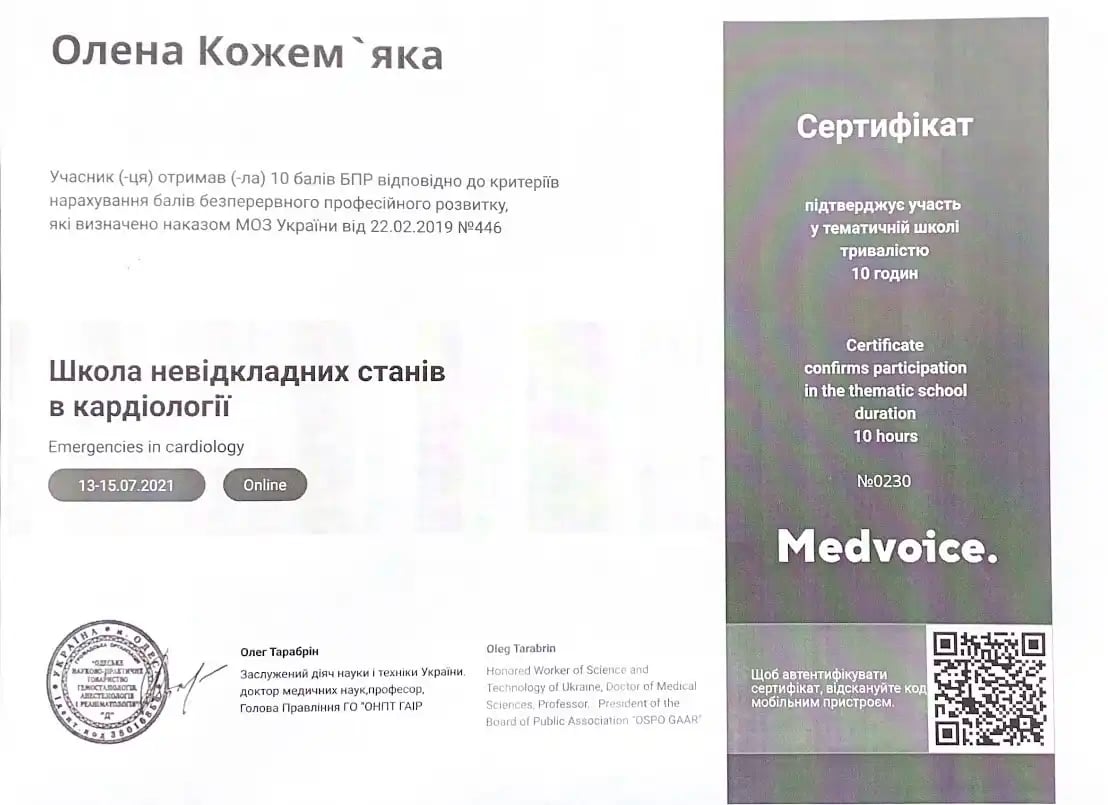Получила специализацию по нефрологии в Харьковской медицинской академии последипломного образования.