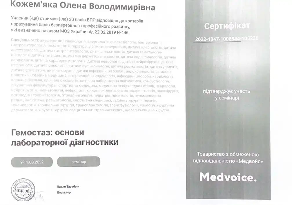 Получила специализацию по трансфузиологии в НМАПО им. П.Л. Шупика