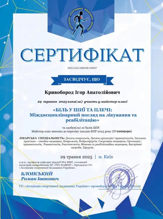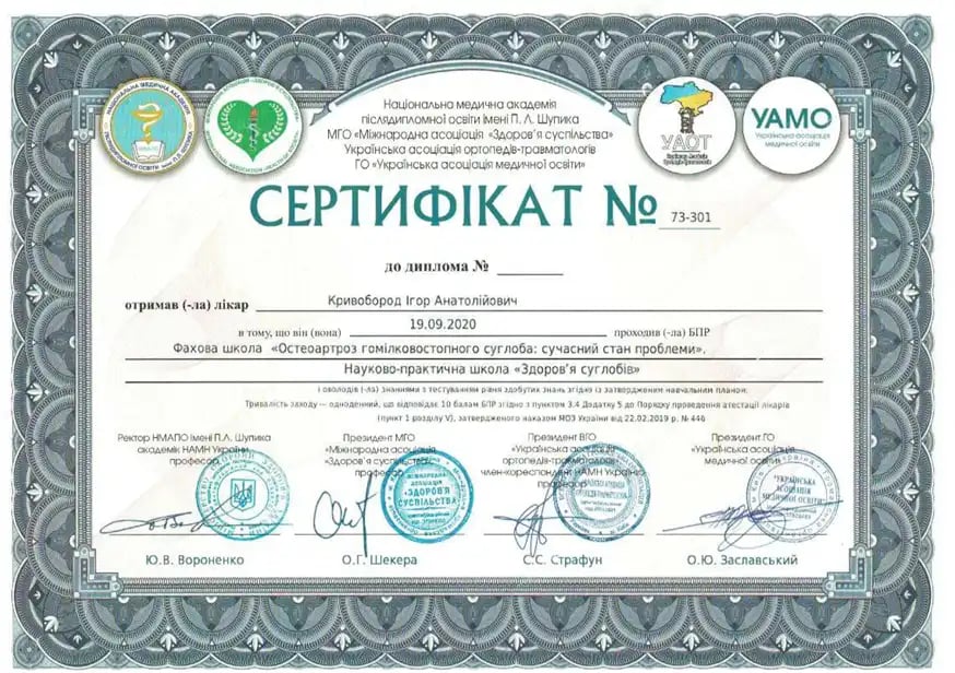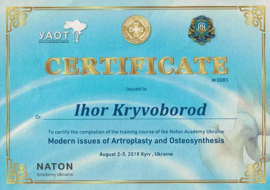 Проходил интернатуру на базе ортопедического и травматологического отделения Черкасской областной больницы и Киевской областной больницы № 2