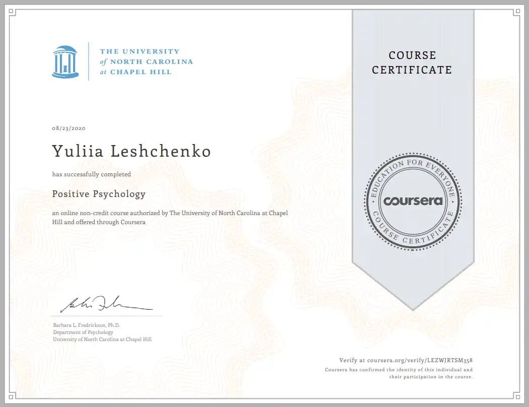 Успешно прошла онлайн-курс «Позитивная психология» под руководством доктора философии Барбары Л. Фредриксон. Университет Северной Каролины, Чапел-Хилл.