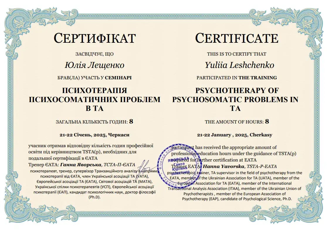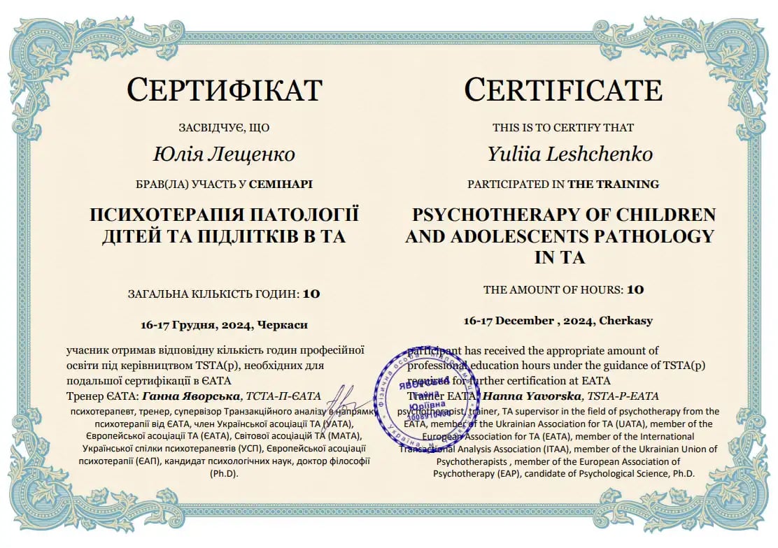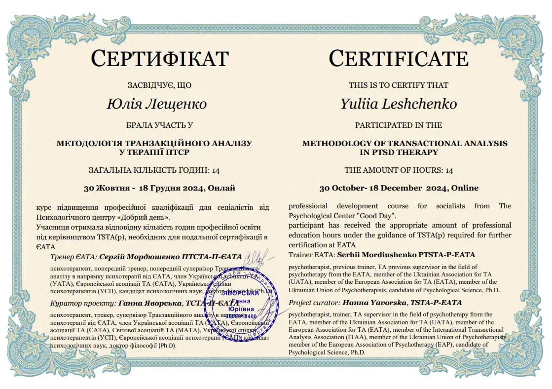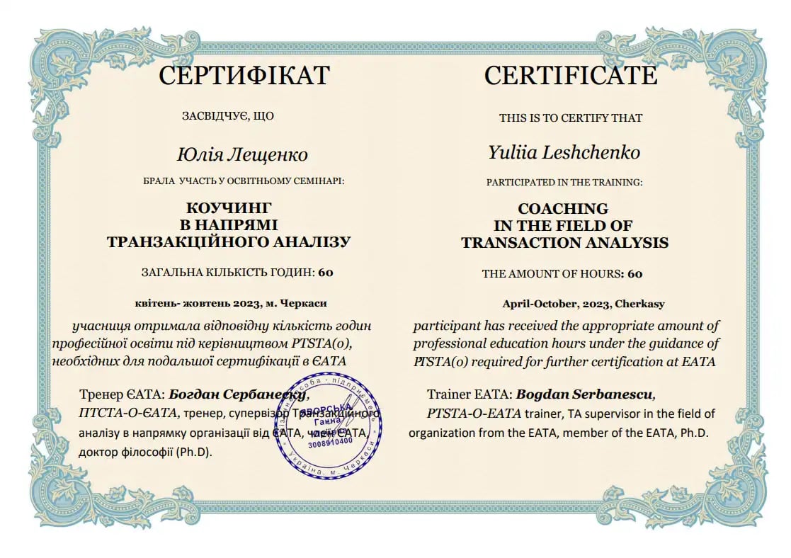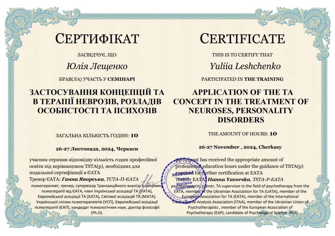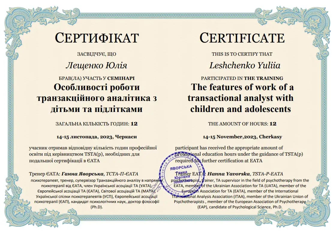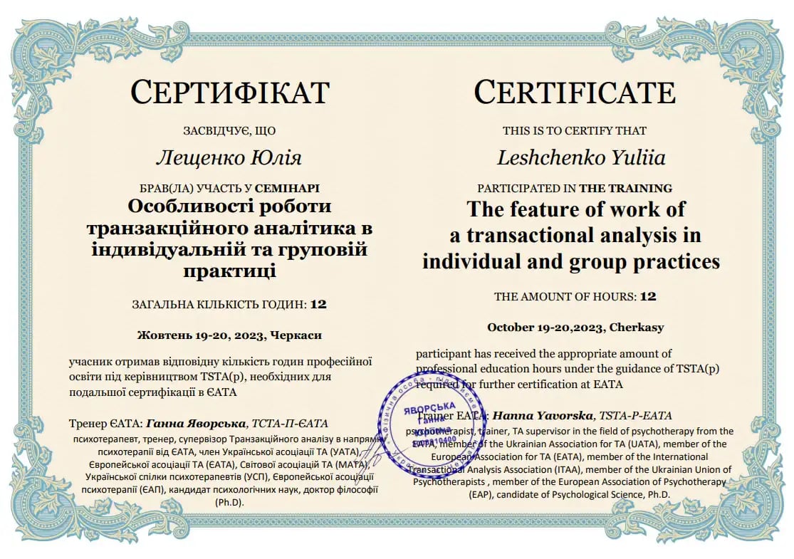 Заканчивает четвёртый курс четырёхлетнего обучения транзакционному анализу по направлению «Психотерапия» Анна Яворская (психотерапевт, тренер, супервизор ТСТА-П-ЕАТА. транзакционного анализа в направлении психотерапии от ЕАТА, член Украинской ассоциации Украинского союза психотерапевтов (УСП), Европейской ассоциации психотерапии (ЕАП), кандидат психологических наук, доктор философии (Ph.D)).