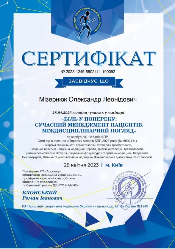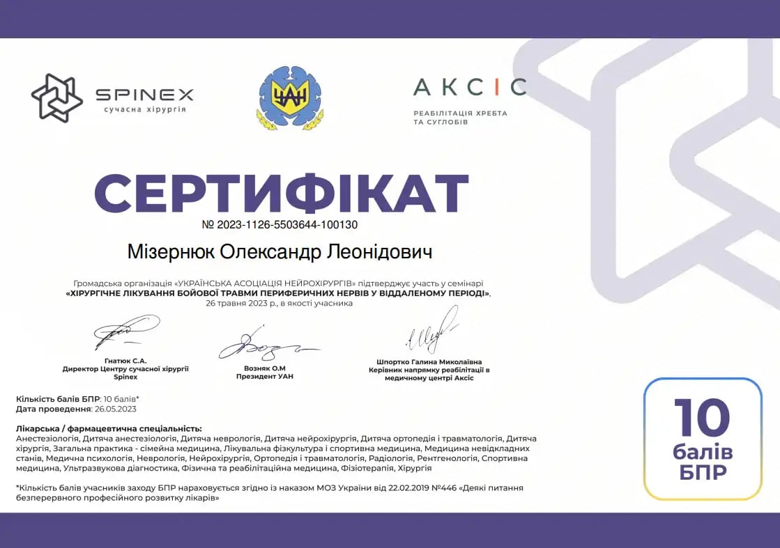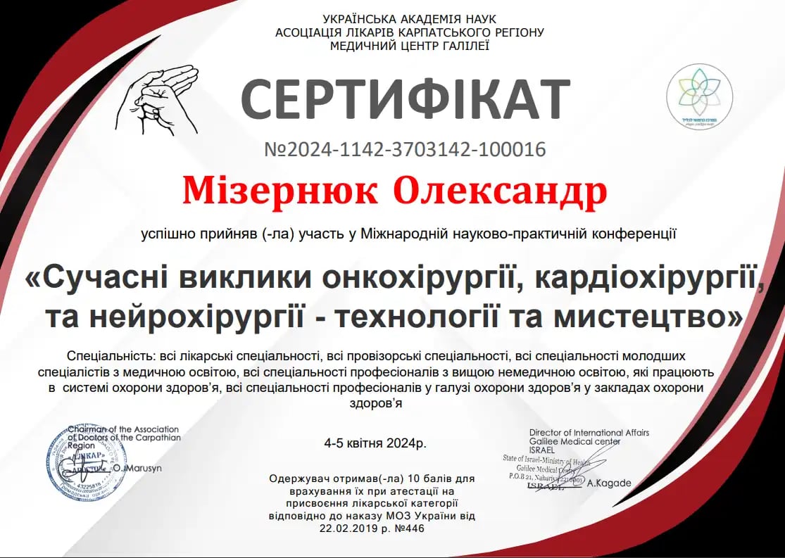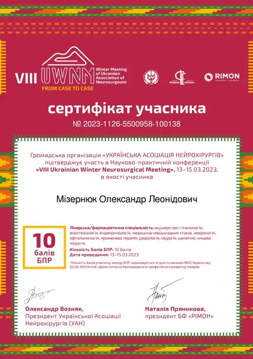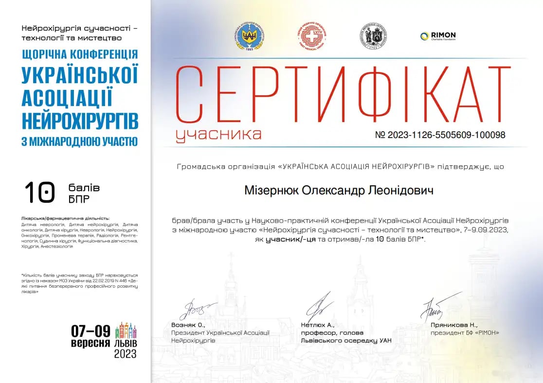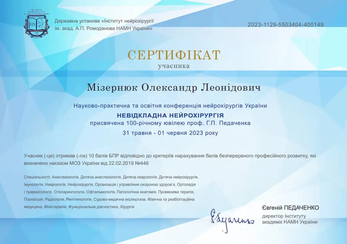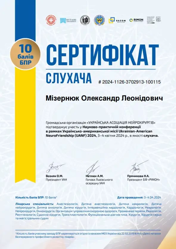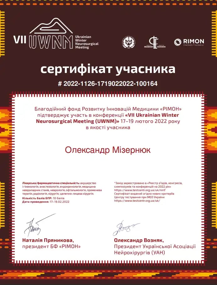 Зачислен в интернатуру по специальности «Нейрохирургия» с прохождением очной части на базе «НМУ им. А.А. Богомольца» и заочной части на базе КНП «Третья Черкасская городская больница скорой медицинской помощи»