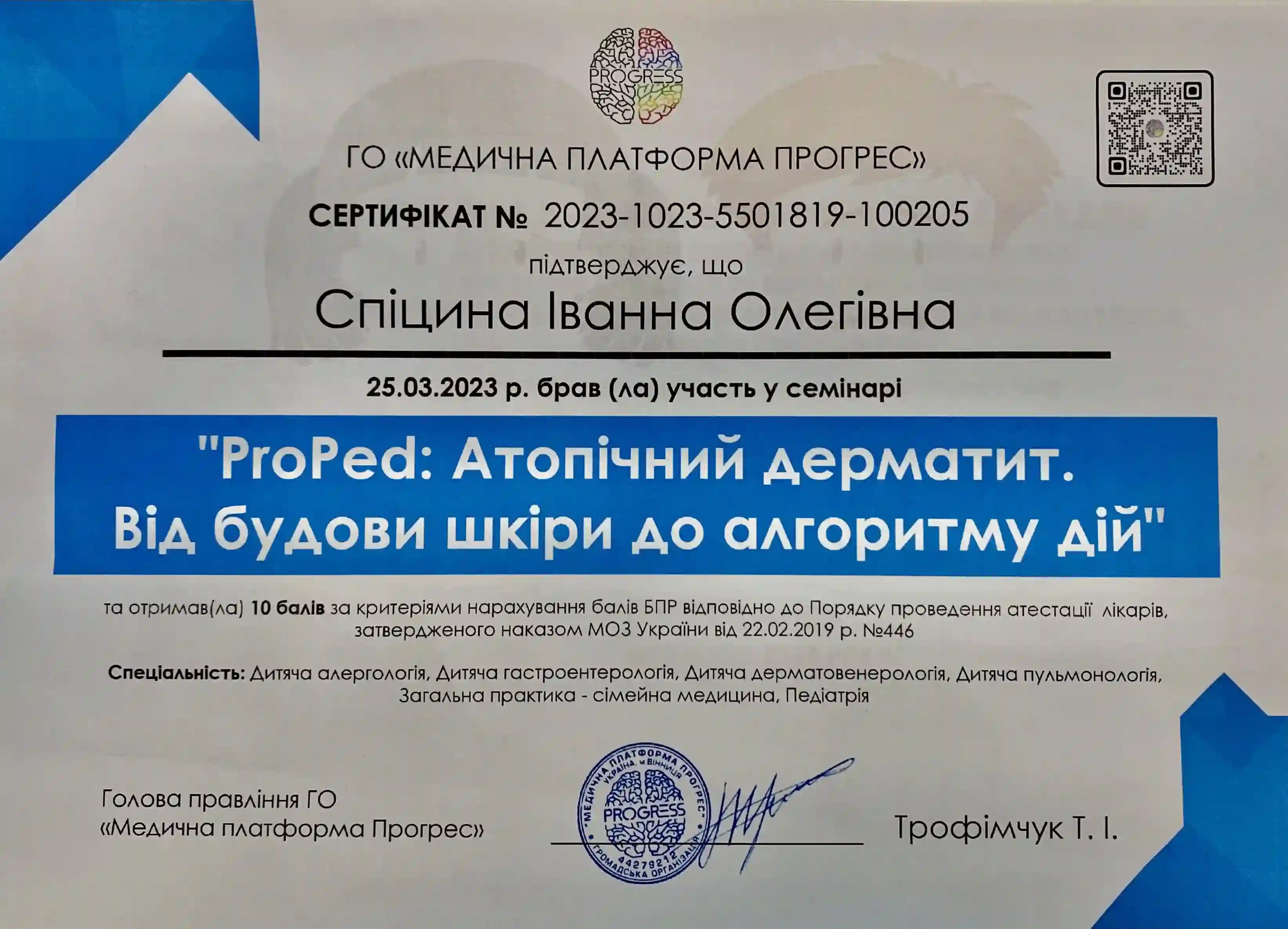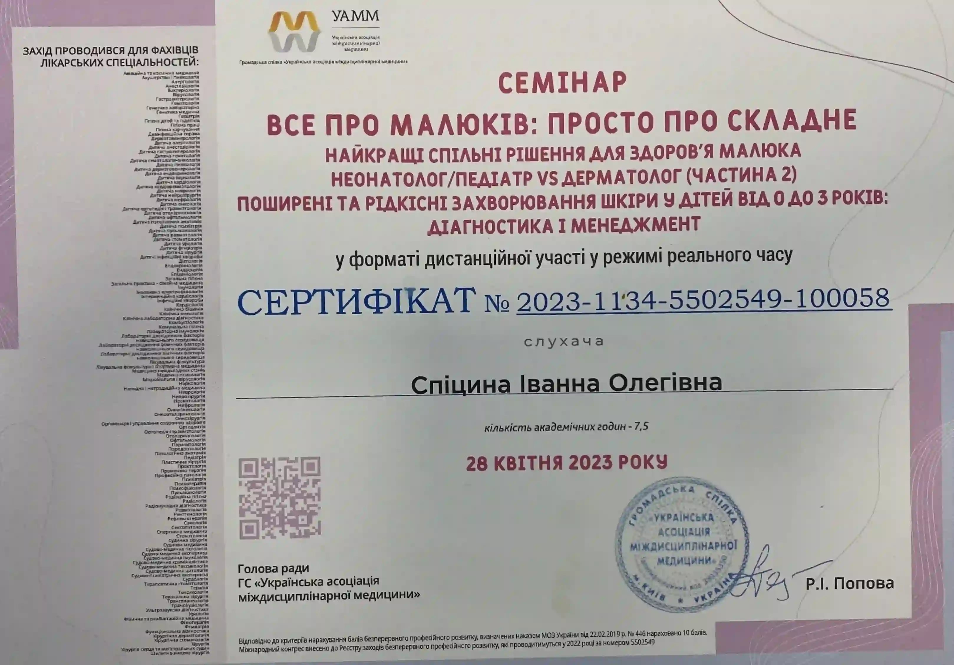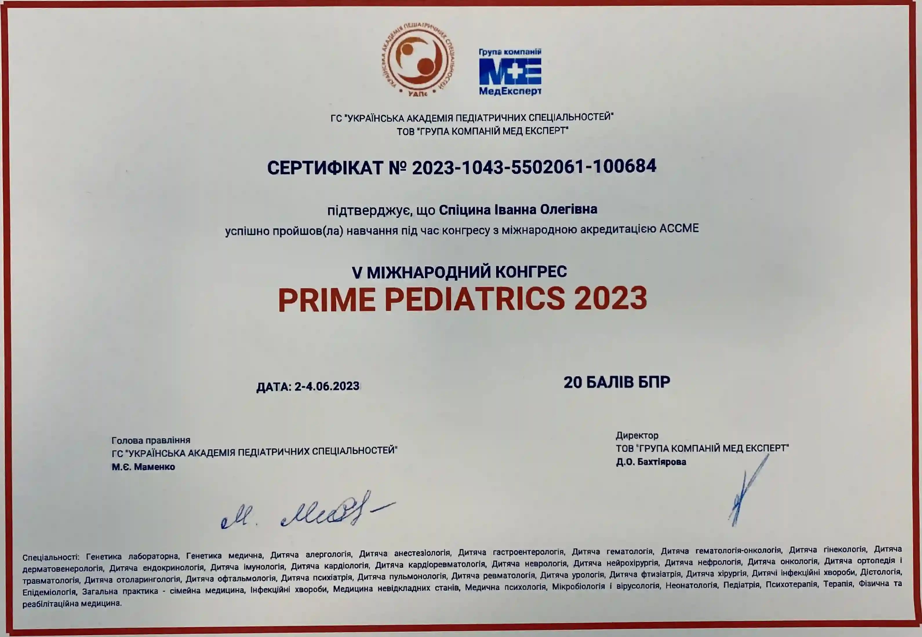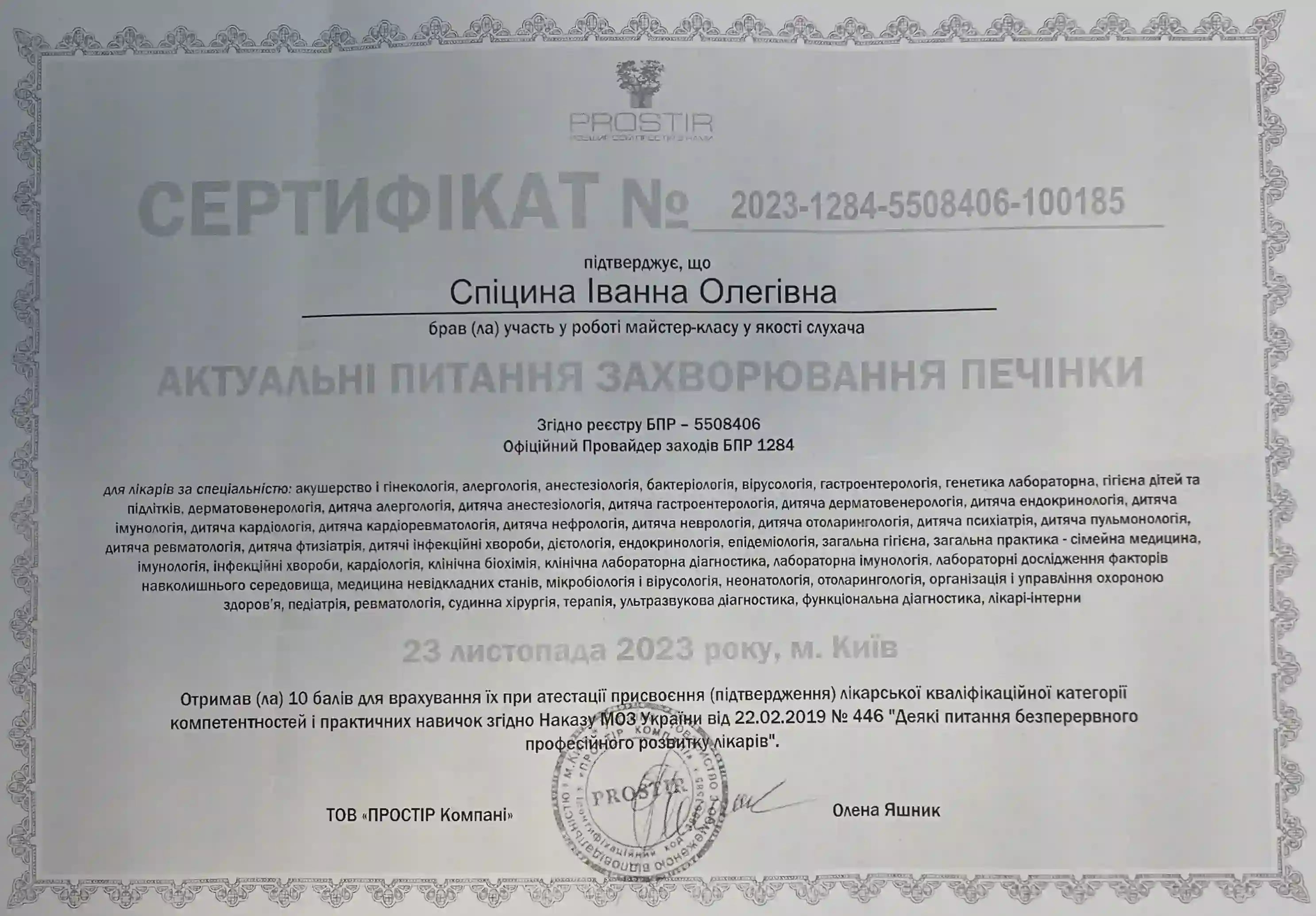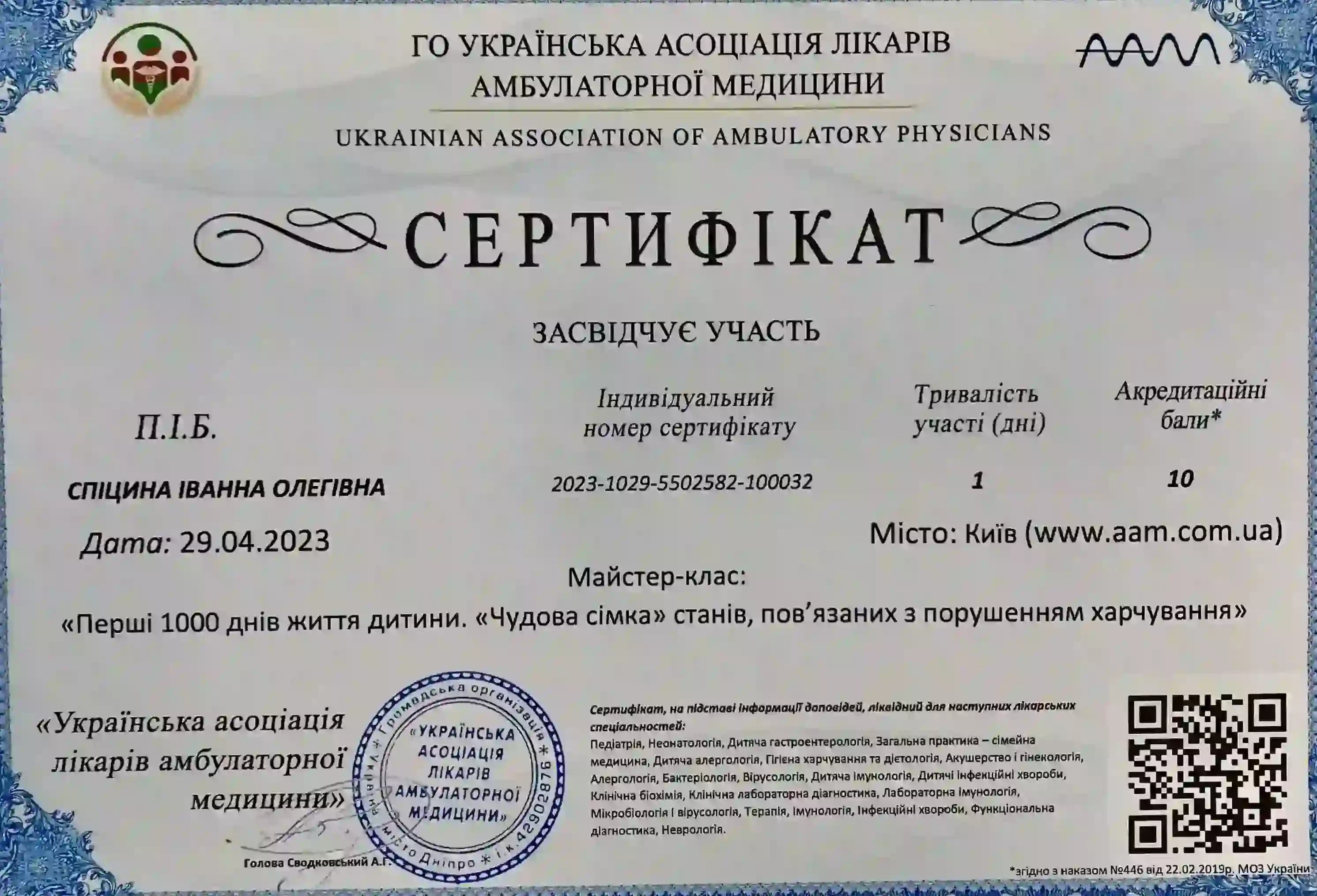 Закончила интернатуру по специальности «Педиатрия» в НМАПО им. П.Л. Шупика