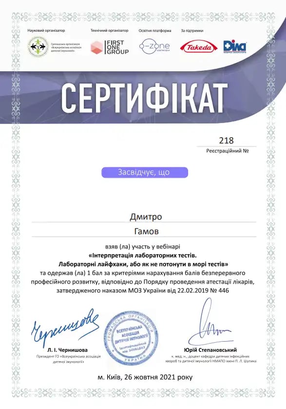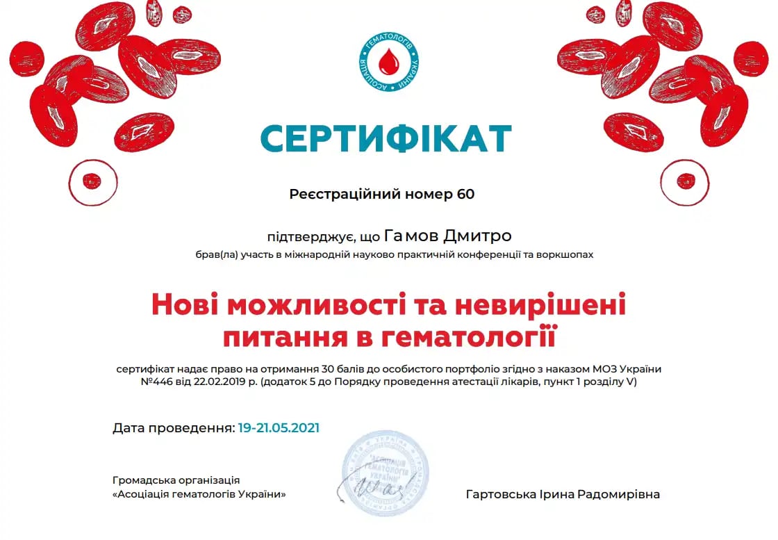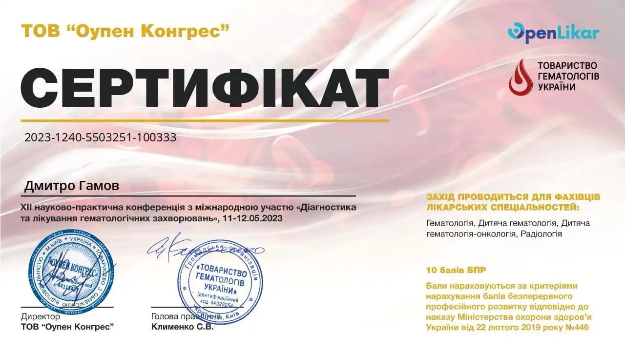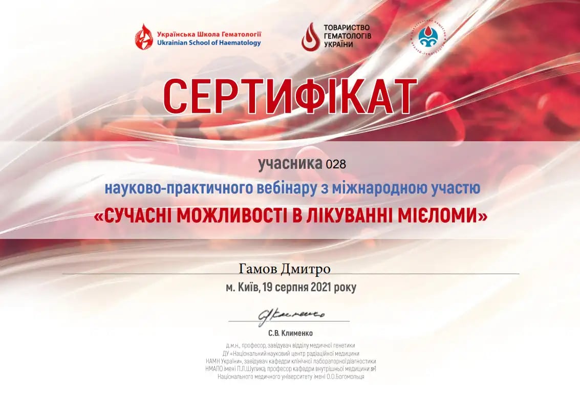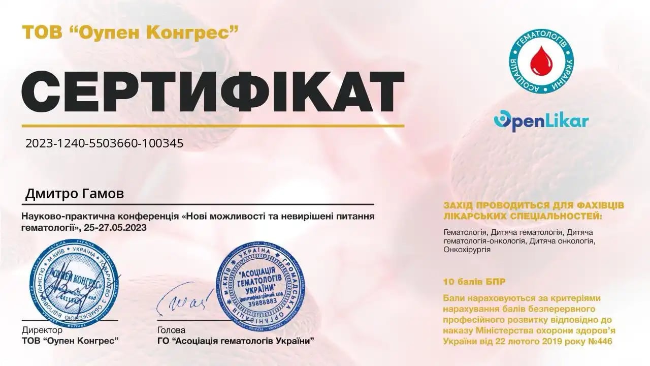 Національна медична академія післядипломної освіти імені П.Л. Шупика, спеціалізація з гематології.