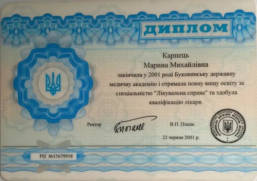 Закінчила Буковинську державну медичну академію за спеціальністю «Лікувальна справа»
