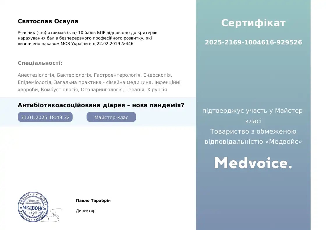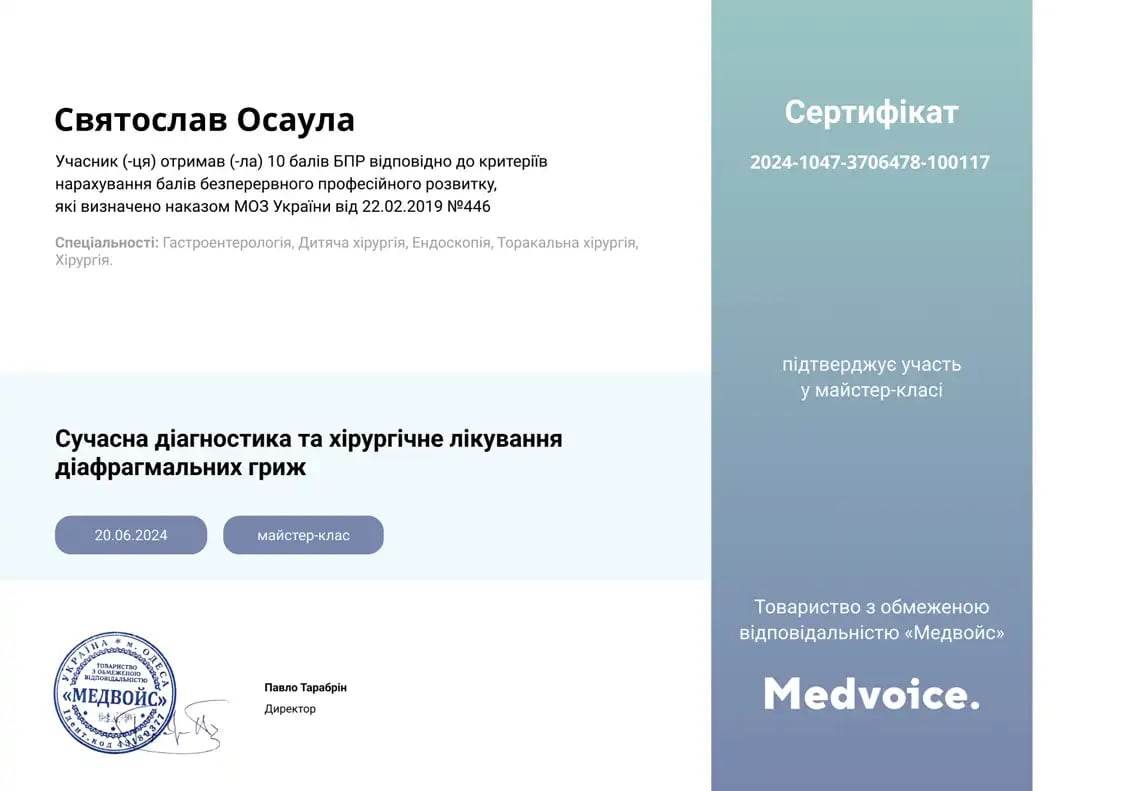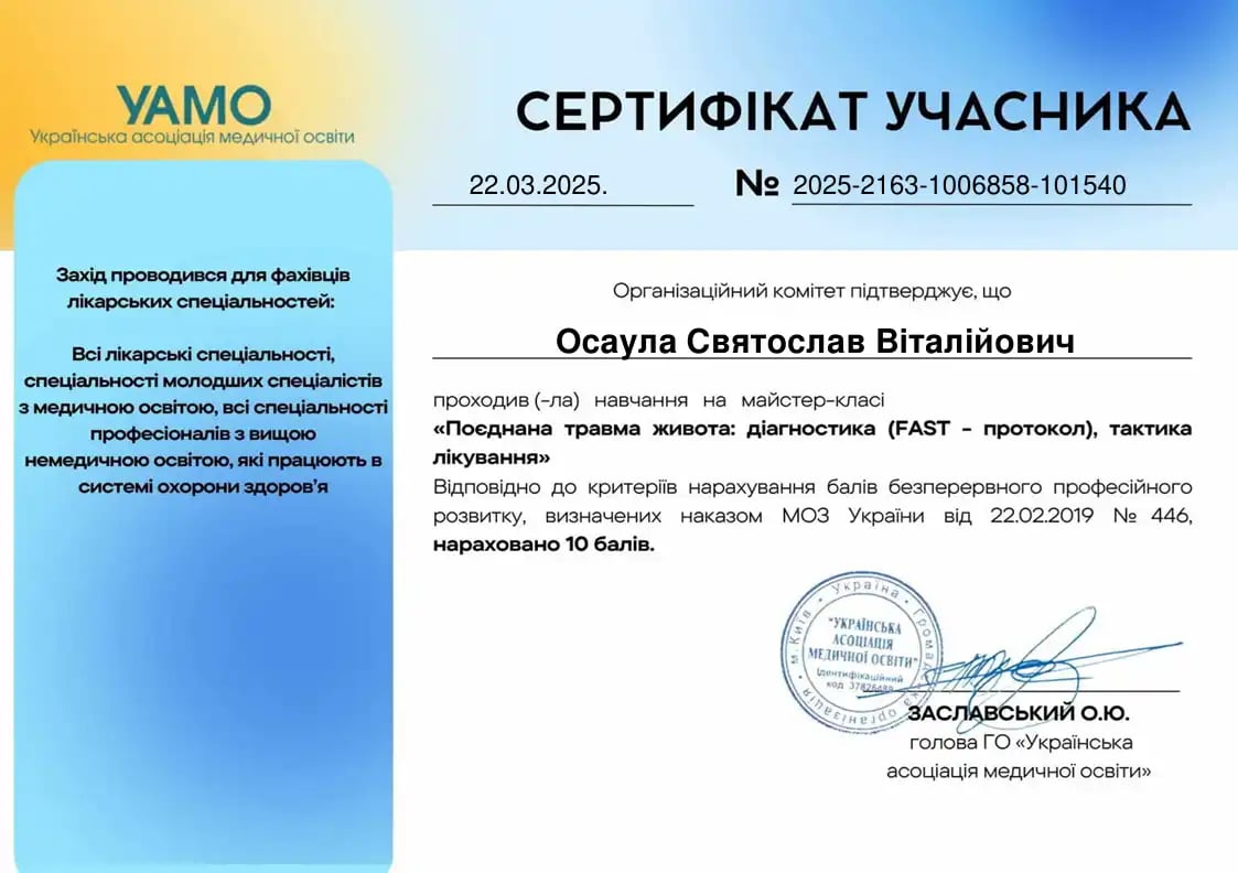 Закінчив спеціалізацію по ендоскопії в Харківському медичному університеті, отримав сертифікат. З лютого по липень працював ургентним ендоскопістом в КНП Третя Черкаська міська лікарня швидкої медичної допомоги.
