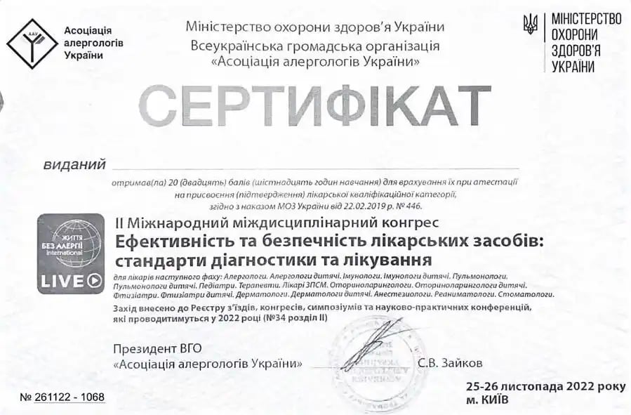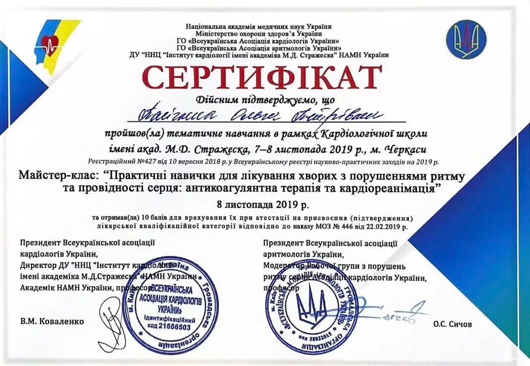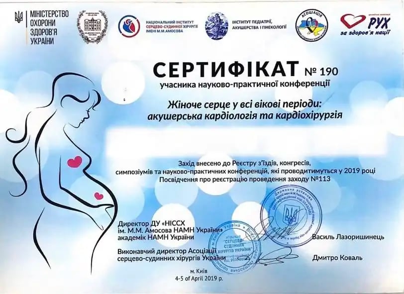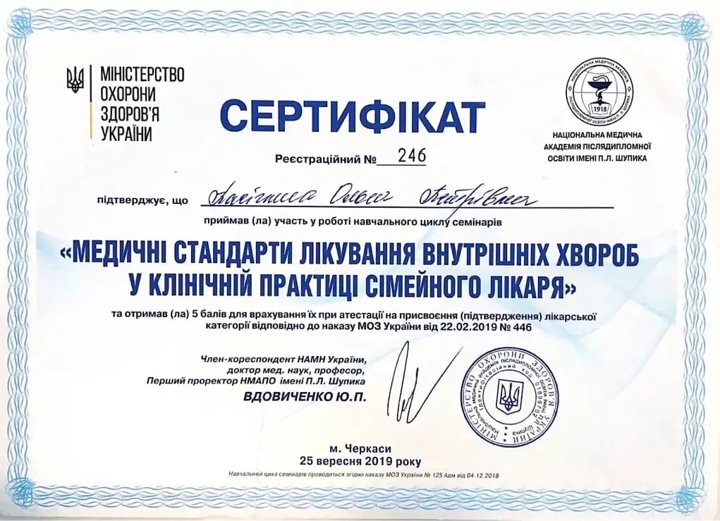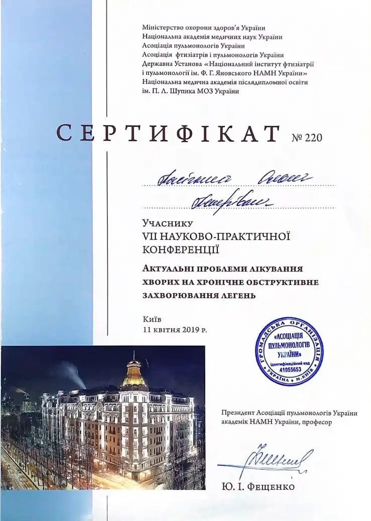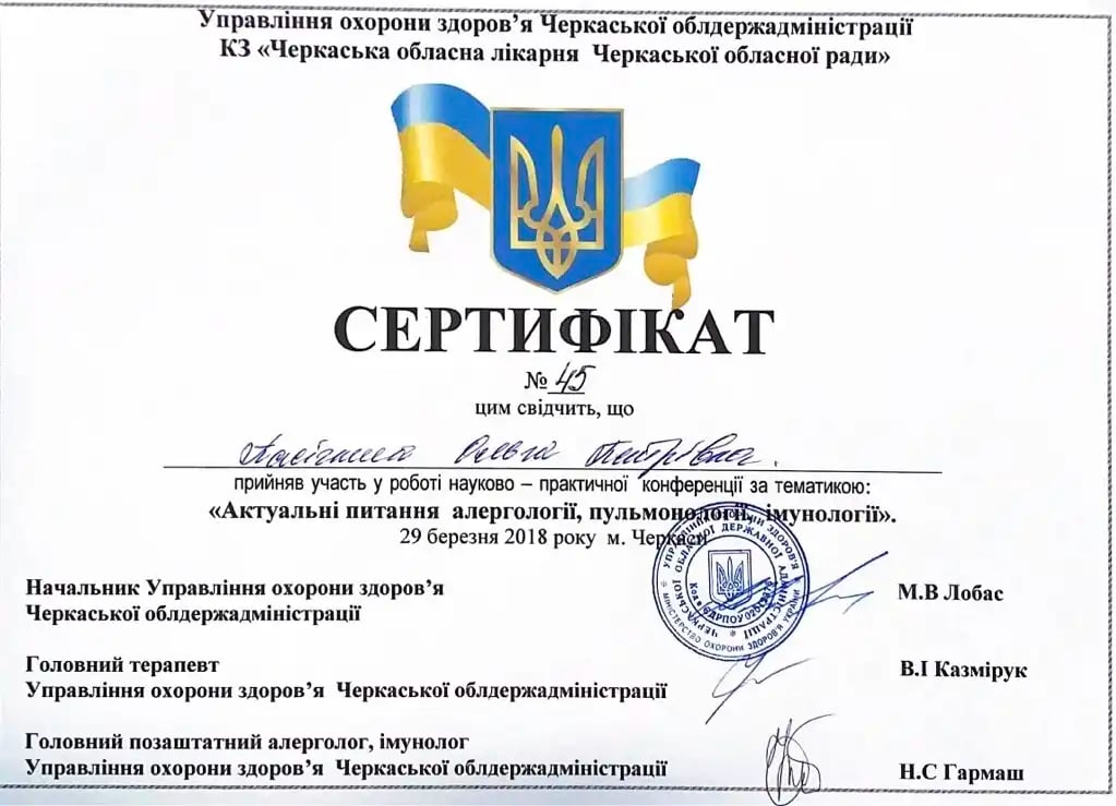 Пройшла курси підвищення кваліфікації зі спеціальностей: "Терапія", "Пульмонологія" на базі національної медичної академії ім. П.Л.Шупика.