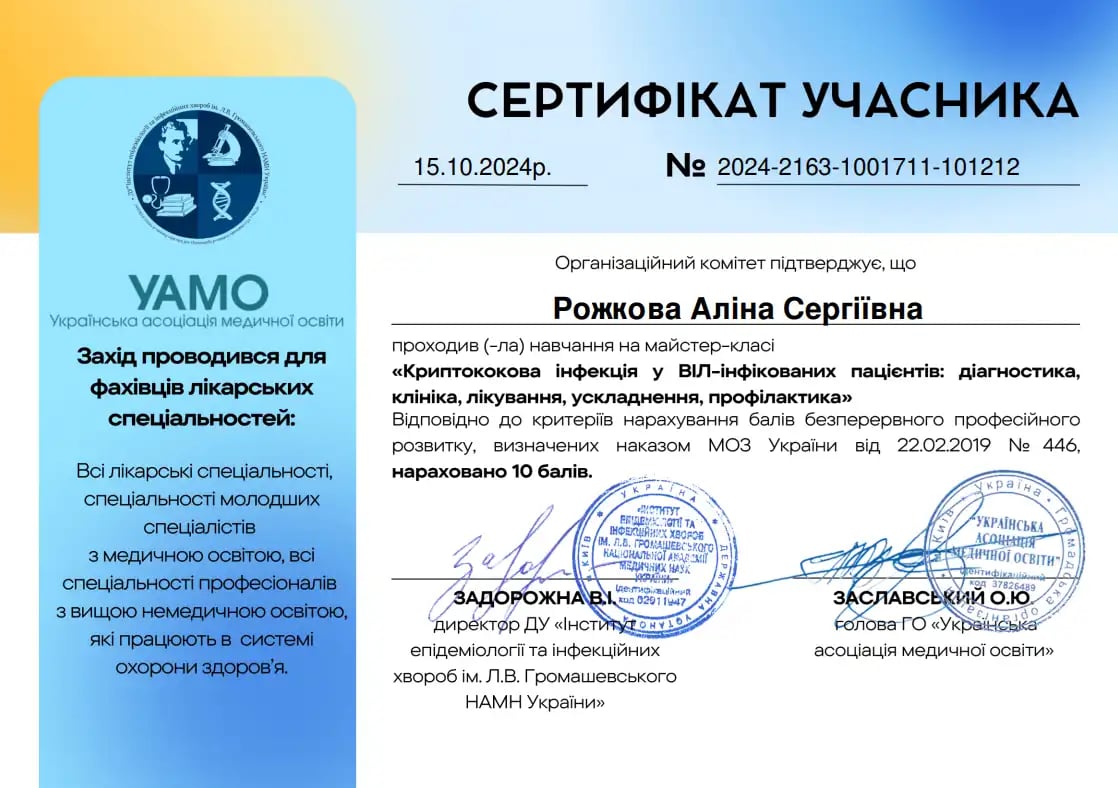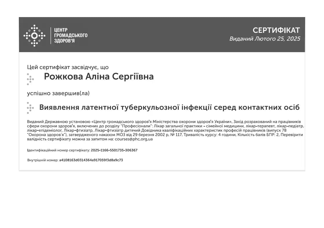 "Черкаський обласний протитуберкульозний диспансер Черкаської обласної ради" на посаді лікаря-пульмонолога дитячого.