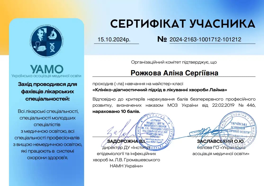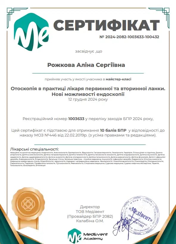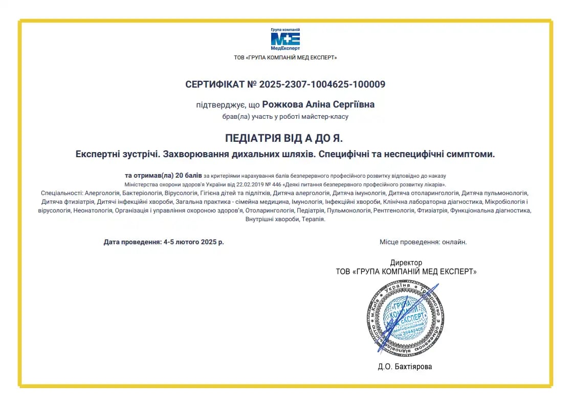 Отримала спеціалізацію "Дитяча пульмонологія" в ЛНМУ ім. Данила Галицького.