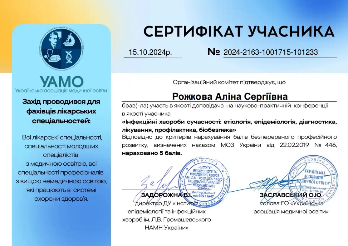 Закінчила інтернатуру в НУОЗУ ім. П.Л. Шупика за спеціальністю "педіатрія"